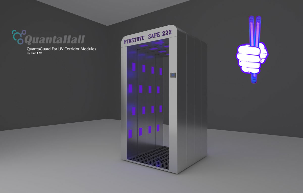 The QuantaHall is an extendable modular Far-UV corridor design decontamination passageway to overcome single light pass Far-UVC gate designs’ shortcomings.